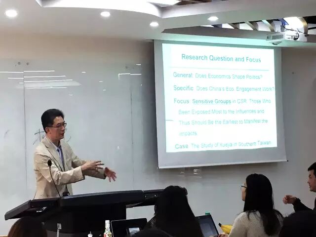 讲座一开始,教授就问了我们一个有趣的问题:“给你们足够多的钱,你们是否愿意离开你心爱的那个TA?”在大家的笑声中,教授抛出了第一个需要我们思考的话题:经济是否能够影响政治。围绕着这个话题,耿教授介绍了不同时期大陆出台的有关促进两岸关系之间的政策,并以台湾学甲的“契作”为例,讲述了大陆的惠台政策,以及它的效果。