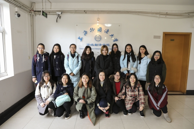 此行除了参与会议,卓越学院的同学们还在周方舟老师的带领下参观了高翻学院。周老师特别介绍了曾举办过联合国会议的同声传译会议室,而同学们纷纷坐进口译员的“小箱子”,戴上耳机,过了一把“翻译官”的瘾。