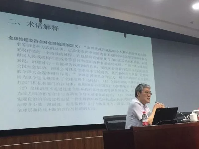 资本主义的产生促使了“世界历史”的形成,创造了“现代世界体系”——资本主义世界经济体和现代国家体系。冷战结束后,经济全球化推动了当代“全球化”的进程。而对于“全球治理”,教授给出了全球治理委员会的定义:“治理是或公或私的个人和机构管理其共同事务的诸种方式的总和。它是使彼此冲突的或各不相同的利益得以调和并联合采取行动的一个持续的过程。它包括具有强制执行力的正式机构和机制,以及得到任命或机构同意或者符合其利益的各种非正式的安排。”而“从全球角度来说,治理过去一直被视为政府间的关系,而现在必须看到它还与非政府组织,公民社会运动,跨国公司以及全球资本市场有关。凡此种种均与具有广泛影响的全球大众媒体相互作用。”通俗来讲,全球治理即是从“无序”的国际体系中寻求有序,从而应对其中种种的全球性挑战。