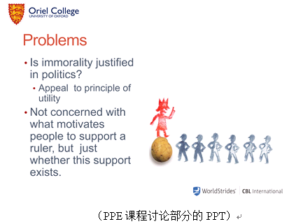 我前两周的学习在牛津大学的Oriel College, 第一周的课程类别是PPE,即Philosophy,Politics and Economics,其被誉为人文社科类最顶尖的专业之一,最初由英国牛津大学的贝利奥尔学院设立,距今已有一百多年的历史,中国国内开设此专业的高校仅有四所:清华大学、北京大学和中国人民大学以及南开大学。具体课程上的是Historic Political and Economic Philosophy,其中涉及到个人生活和政治集体的哲学思想发展根源,课程也向我们介绍了从古希腊时期到19世纪的具有影响力的人物和作品,专注于他们的思想和对现今人们价值观的影响,由牛津大学此专业的研究生Catrin Gibson进行教学。